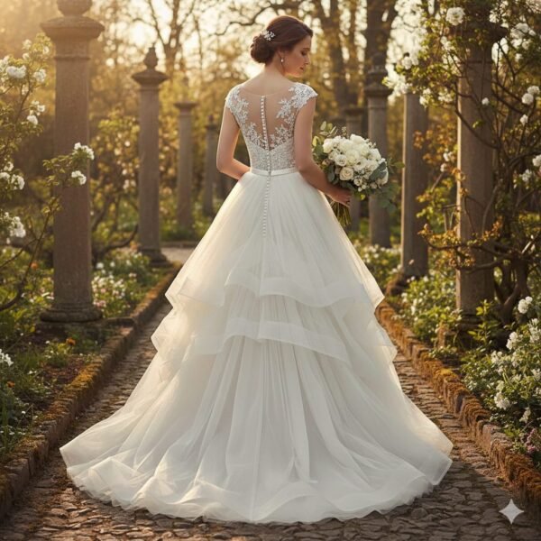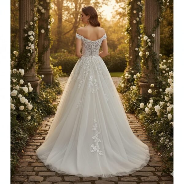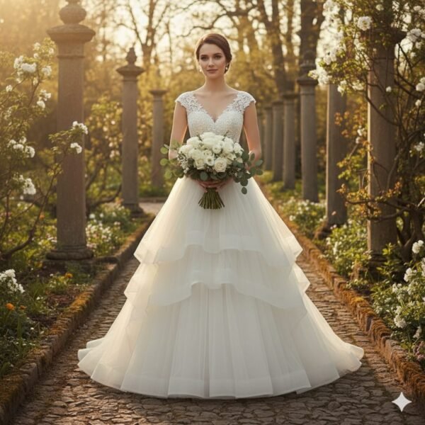 Handcrafted floral lace, premium soft tulle, and expertly structured tailoring ensure exceptional comfort and a flawless fit. Whether you’re walking down a stone pathway or entering a grand venue, this gown guarantees a truly magical bridal moment.
