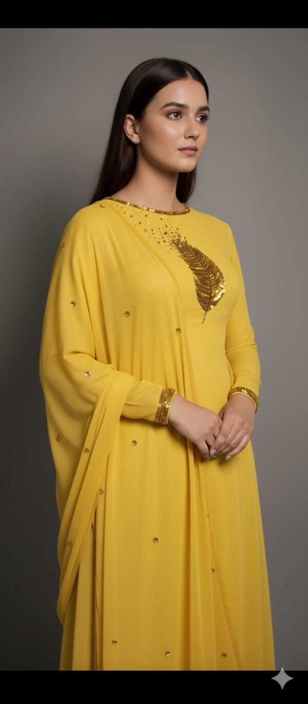 Step into elegance with this stunning Yellow Embellished Anarkali Set designed to bring out your natural glow. The rich mustard-yellow color combined with intricate sequin detailing adds a festive yet refined appeal. Crafted with soft, flowy fabric, this ensemble ensures comfort without compromising on style.